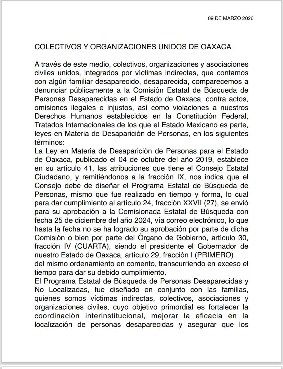 Oaxaca.-Colectivos y organizaciones Unidos de Oaxaca, integrados por familiares de personas desaparecidas, denunciaron omisiones y violaciones a sus derechos humanos por parte del Gobierno del Estado y de la Comisión Estatal de Búsqueda, debido al retraso en la aprobación del Programa Estatal de Búsqueda de Personas.